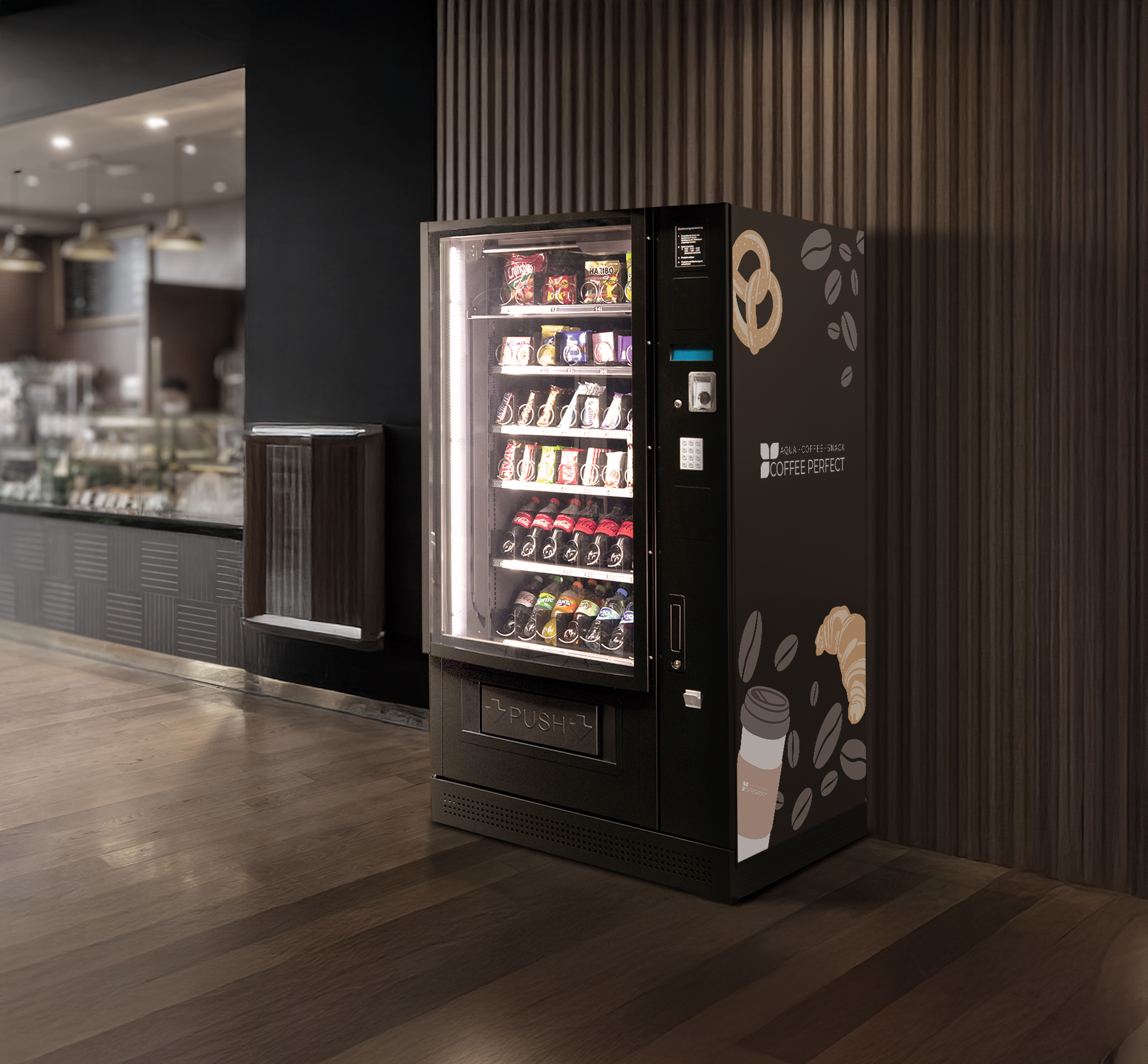 Ob in der Lounge, im Empfangsbereich oder im Pausenraum – Ihr Snackautomat wird zum Blickfang! Wählen Sie Ihr Lieblingsdesign und verleihen Sie Ihrem Snackautomaten das gewisse Extra: modern, markenstark und ganz einfach umzusetzen.